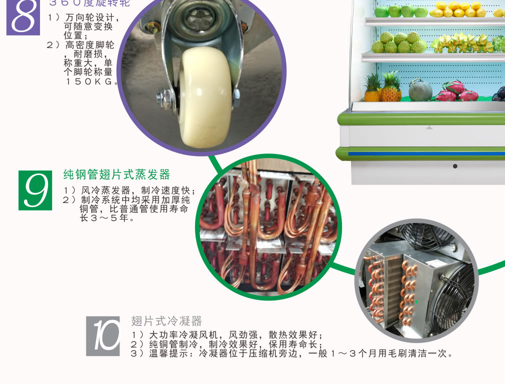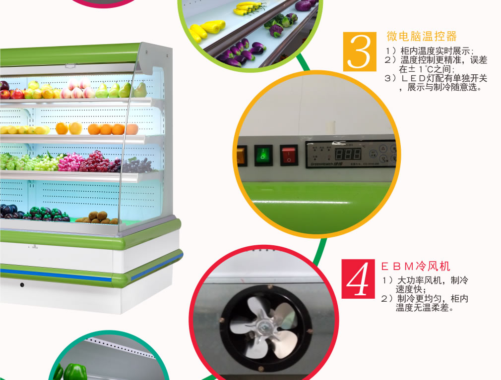 ① 風(fēng)扇或空調(diào)出風(fēng)口不能正對敞口式冷柜吹風(fēng);