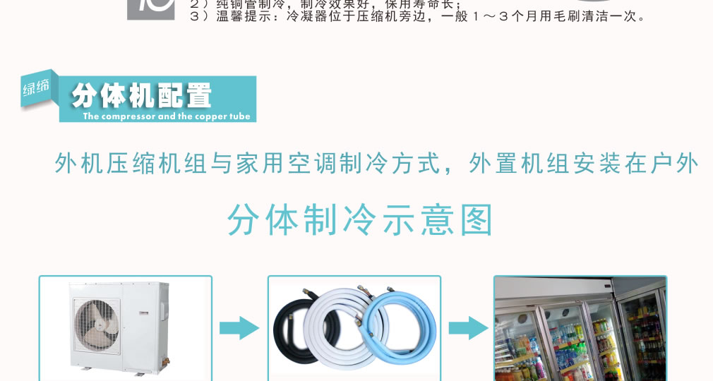③ 選擇平整地面放置冷柜,背部離墻保持15~20CM,方便于機組通風(fēng)散熱;