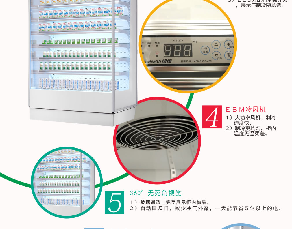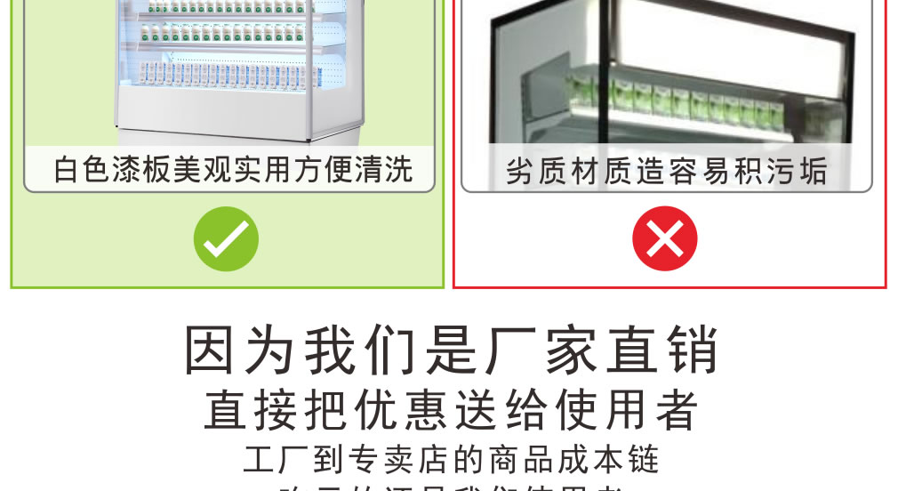 ① 風(fēng)扇或空調(diào)出風(fēng)口不能正對(duì)敞口式冷柜吹風(fēng);
